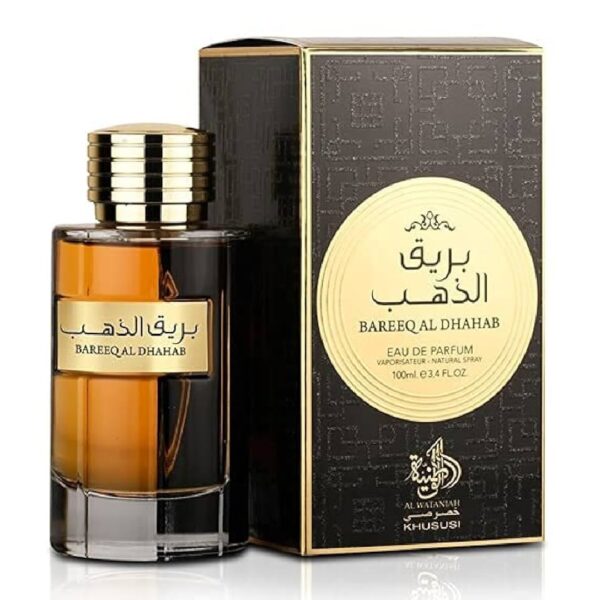 Bareeq Al Dhahab de Al Wataniah é um perfume Oriental Masculino. Esta é uma nova fragrância. Bareeq Al Dhahab foi lançada em 2022. As notas de topo são: Rosa, Açafrão e Pimenta. As notas de coração são: Agarwood (Oud), Caramelo, Patchouli e Notas Florais. As notas de fundo são: Incenso, Âmbar, Notas Amadeiradas e Almíscar.